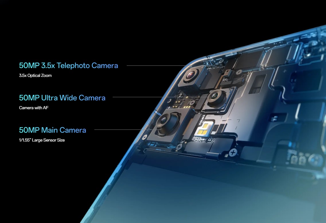 Wide angle: 50MP; f/1.8; FOV 85°; 6P lens; AF supported; 2-axis OIS supported Ultra-wide angle: 50MP; f/2.0; FOV 116°; 6P lens; AF supported Telephoto: 50MP; f/2.8; FOV 30°; 4P lens; AF supported; 2-axis OIS supported |